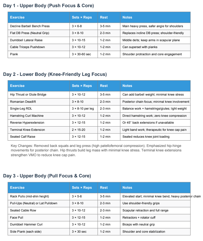 - Personal preferences - I specified I wanted to do three days per week, one hour per workout. I asked it to prioritize hypertrophy (bigger muscle size) and long-term injury prevention.