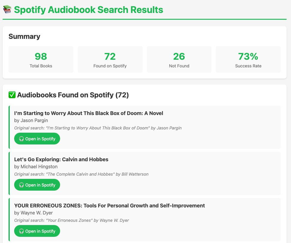 Turns out, it couldn't modify my playlists with just standard credentials, and I didn't want to implement a whole Authorization Code flow, so I told it to output an HTML file instead. After running the script, it output some pretty impressive results...
