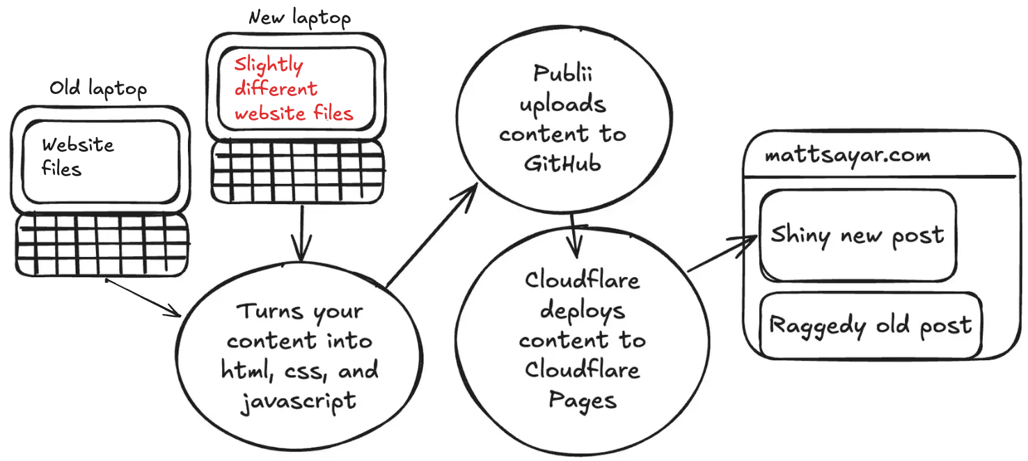 The root cause is that I got a second Mac and used the Migration Assistant to set it up. That worked splendidly, but the way I build my website is by processing a bunch of local files and then uploading them to GitHub. I was using a separate instance of Publii on both laptops to write articles, which meant I had two different versions of my site depending on which laptop I was using!