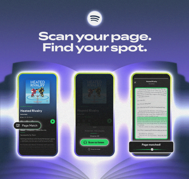 I've been listening to some audiobooks on Spotify since it's included with my Premium subscription. Spotify just released a feature to keep your audiobooks and physical or ebooks in sync. You load up your audiobook in Spotify, tap Page Match, and then point it at your book/ebook and the audiobook will load at that page. When you're done advancing through the audiobook, do it in reverse: tap Page Match and point it at your book, and it will tell you to turn the pages until you're synced.