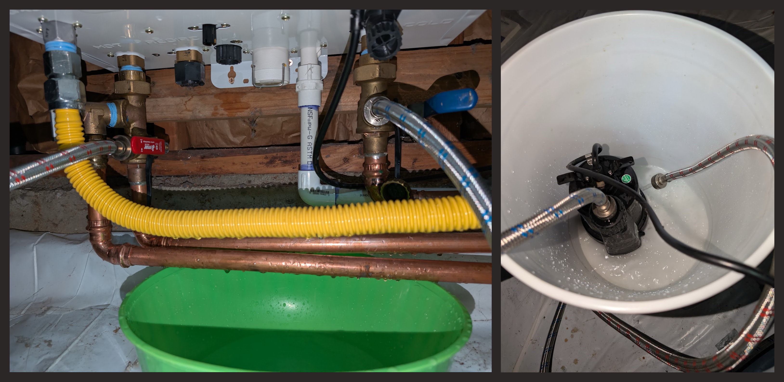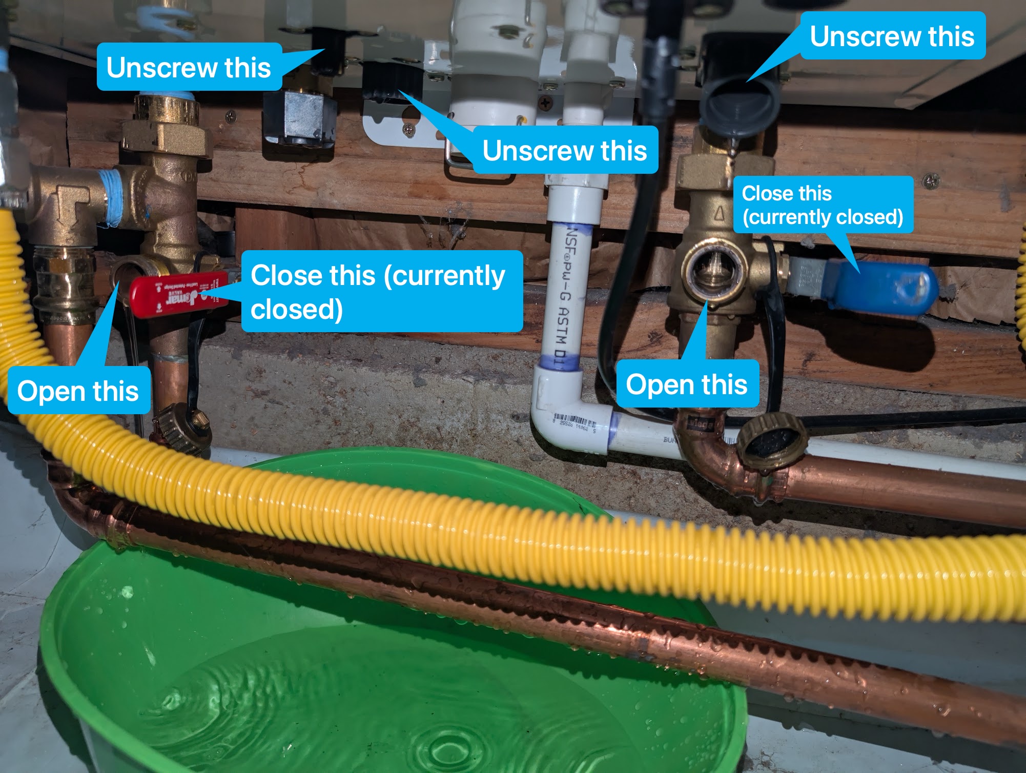 Put the pump and hoses back in the bucket. Towel off any standing water. Maybe one day I won't spill any water during this process, but it hasn't happened yet. Set a reminder for next year with a link to this page.