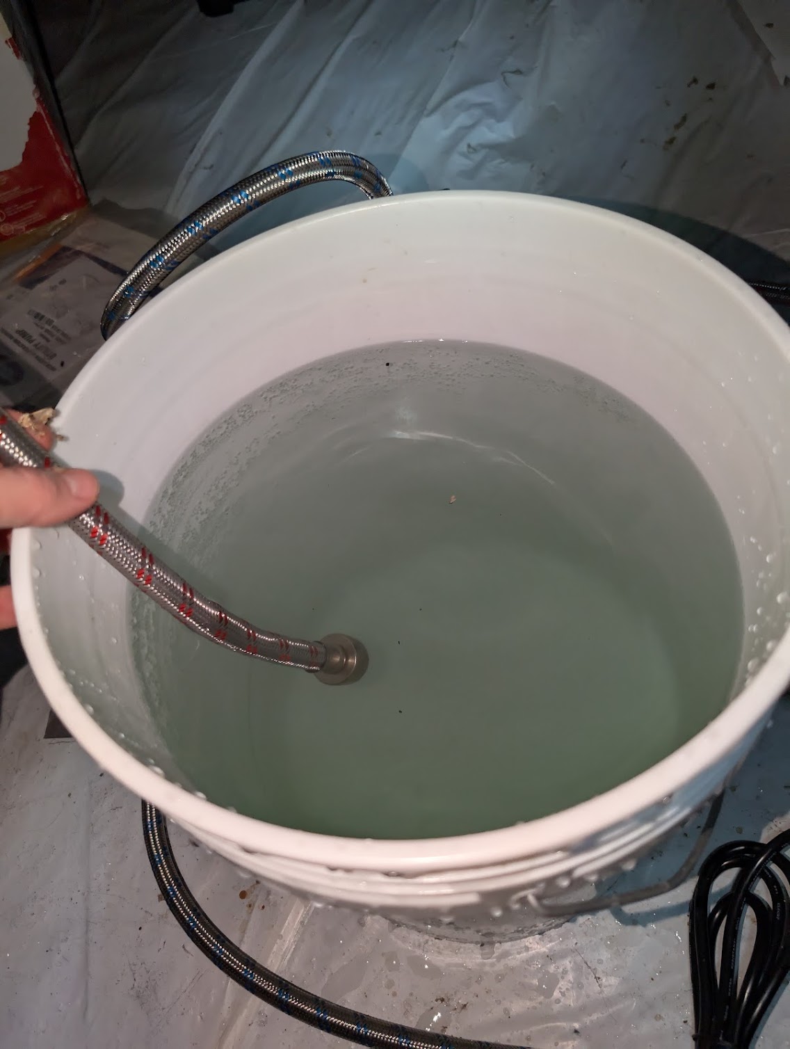 - Fill the bucket, then shut off the blue valve to stop the water flow. Drain the vinegary bucket