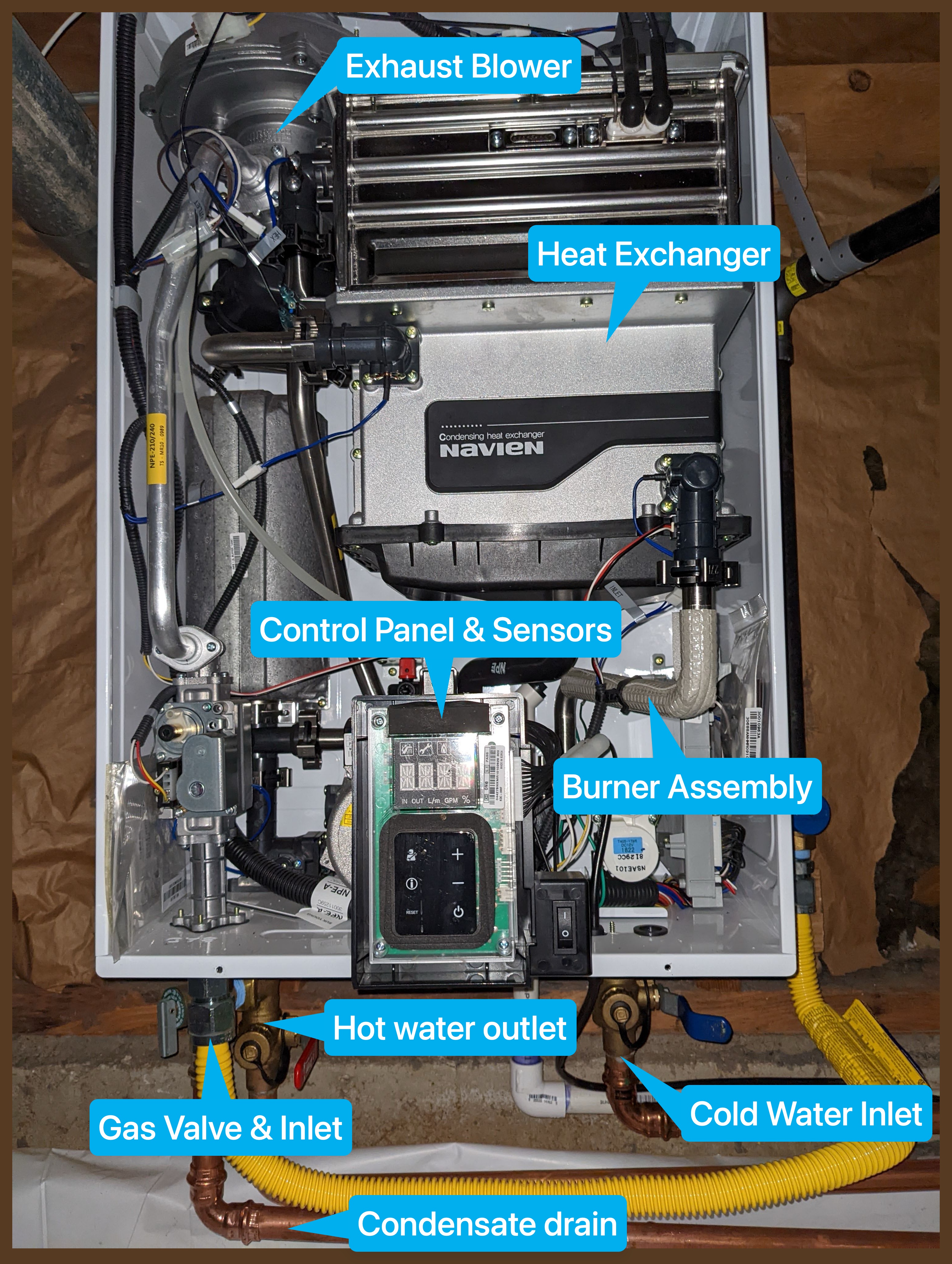 My tankless water heater is a Navien NPE-240A natural gas water heater. That's not an endorsement, since I didn't pick the model; the technician who installed it asked a few questions about my family's desired water demands, then he picked it out. My old water heater was gas, so this one is gas. That said, it works great! But how does it actually work?
